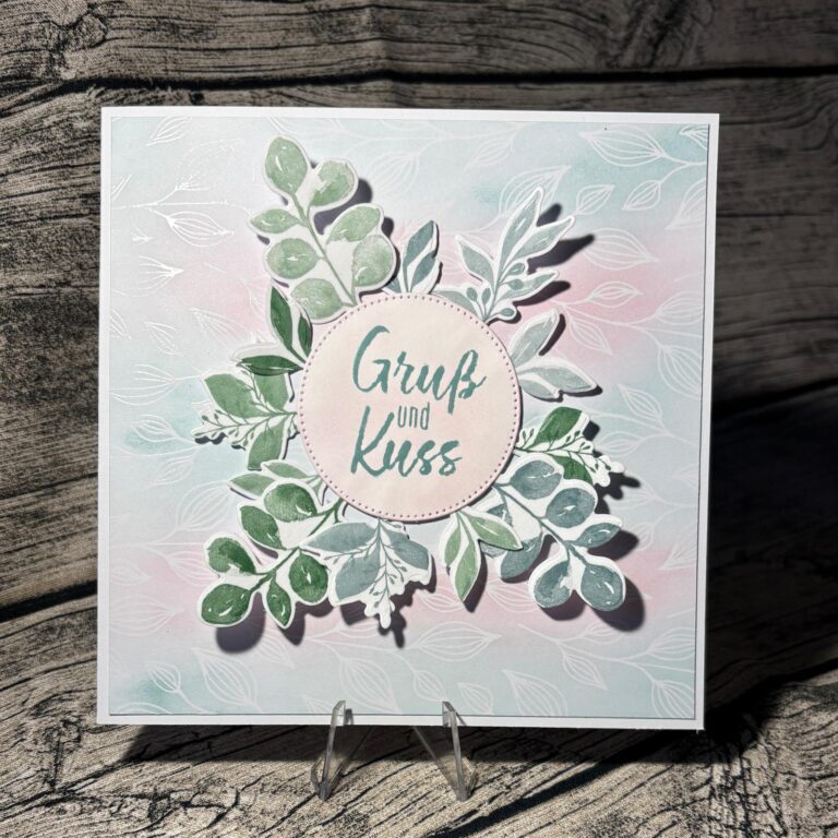 Das aktuelle Thema lautet „Frühling“ – und ich zeige dir eine quadratische Klappkarte in sanften, gedeckten Farbtönen.
