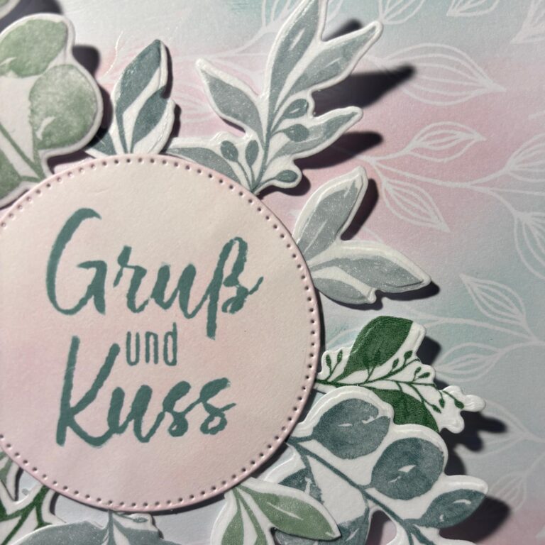 Mittig auf der Mattung habe ich das runde Spruchetikett aus dem Stanzformenset „Basics mit Pep“ platziert. Der Spruch stammt aus dem Produktset „Blätter und Botschaften“.